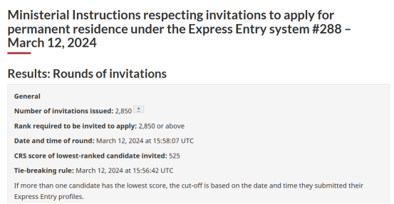 加拿大时间2024年3月12日,联邦快速通道Express Entry第288次邀请,本次为全类别邀请。分数线525,邀请2850人。刚好525分的申请人,需要在2024年3月12日前入池。