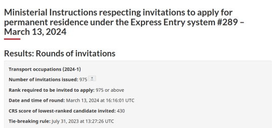 加拿大时间2024年3月13日,联邦快速通道Express Entry第289次邀请,分数线430,邀请975人,本次针对交通运输职业候选人进行邀请。刚好430分的申请人,需要在2023年7月31日前入池。