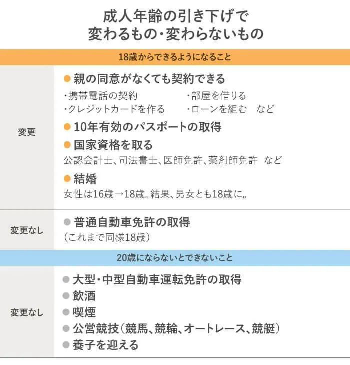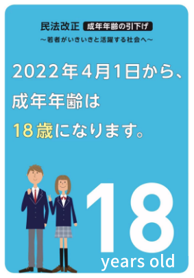 去年日本的《民法修正案》通过,成人年龄无论男女都从20岁降到了18岁,从1876年以来成人年龄一直都设定在20周岁。这个政策已于2022年4月1日起开始执行。