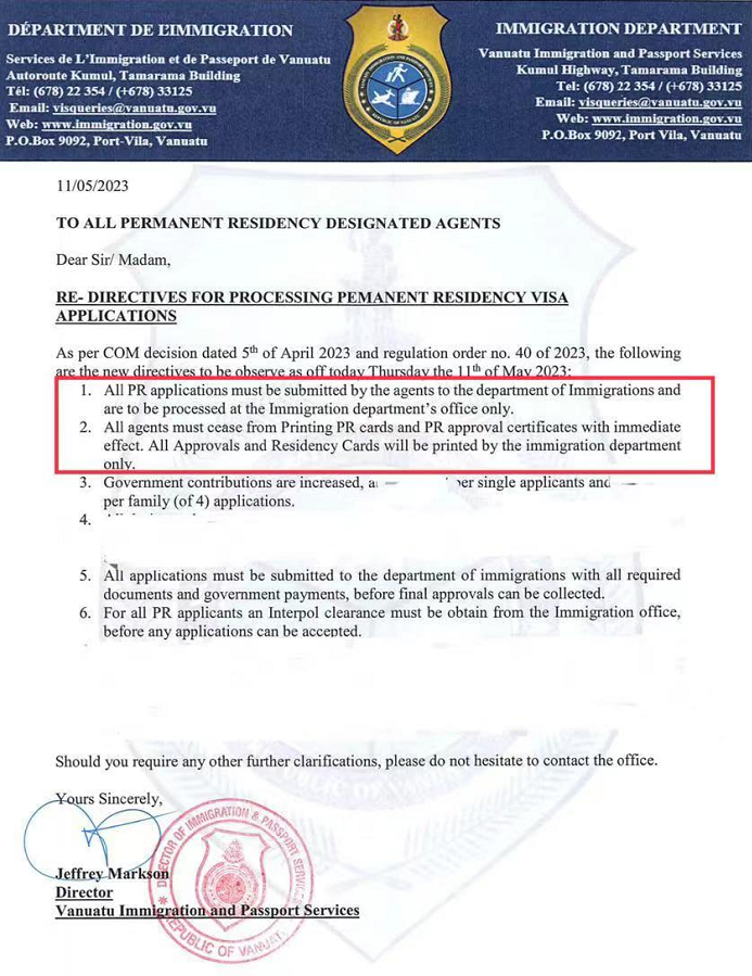 瓦努阿图移民局出台新政策,以后所有永居签证卡(绿卡)将由移民局统一印发,不再由代理机构自行印刷。