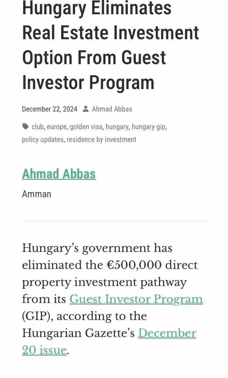 - 2024年12月22日,匈牙利政府正式取消50万欧购房移民政策(项目还未正式推出即取消)。