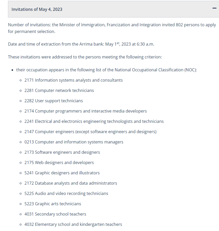 2023年5月4日,魁省移民、特许化和融合部长邀请802人申请永居甄选。从Arrima系统提取的日期和时间:2023年5月1日上午6:30。