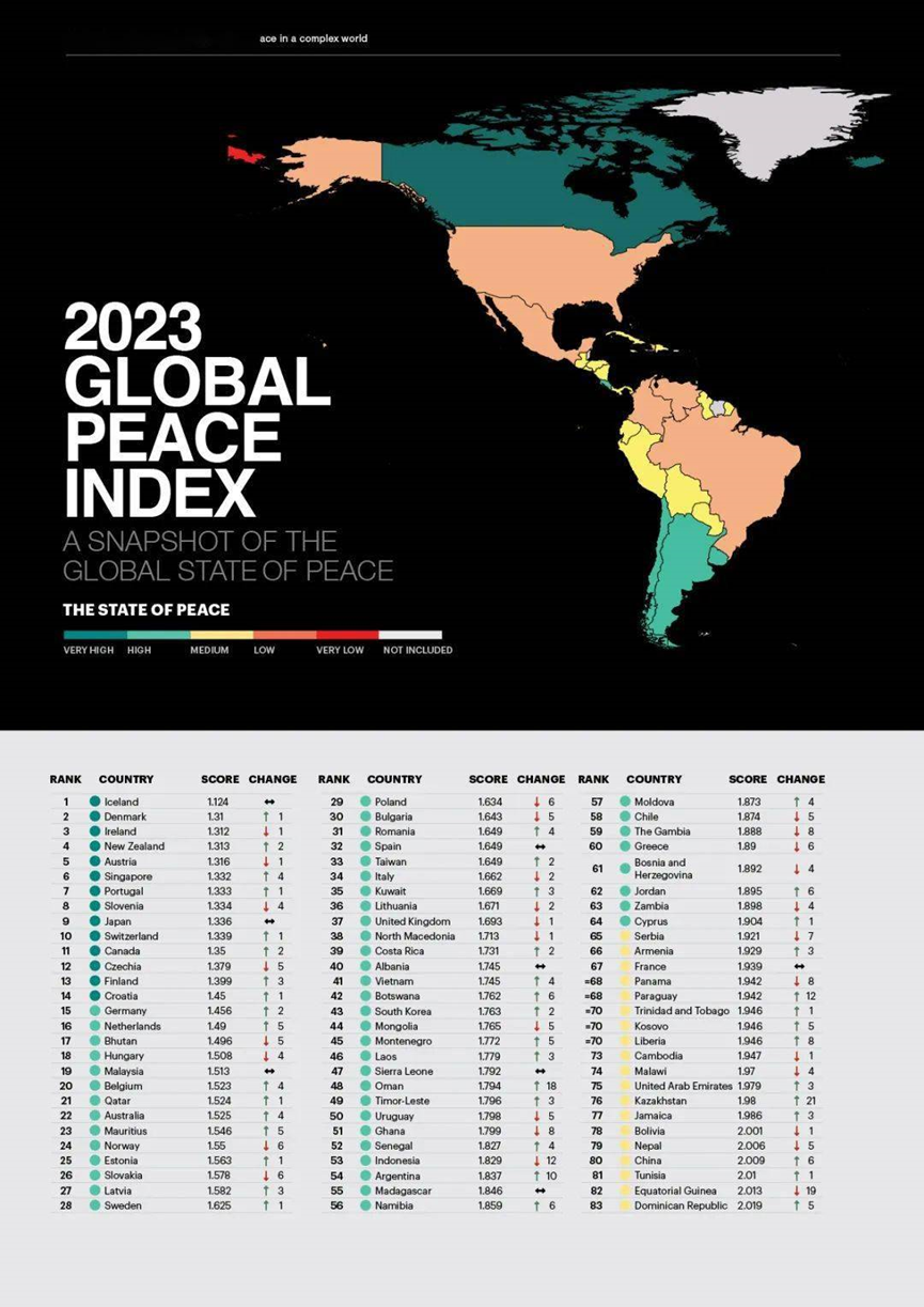 那么,今年全球哪些国家比较和平和安全呢?国际智库经济与和平研究所(Institute for Economics and Peace)发布的2023年全球和平指数显示,冰岛、丹麦和爱尔兰位居前三。