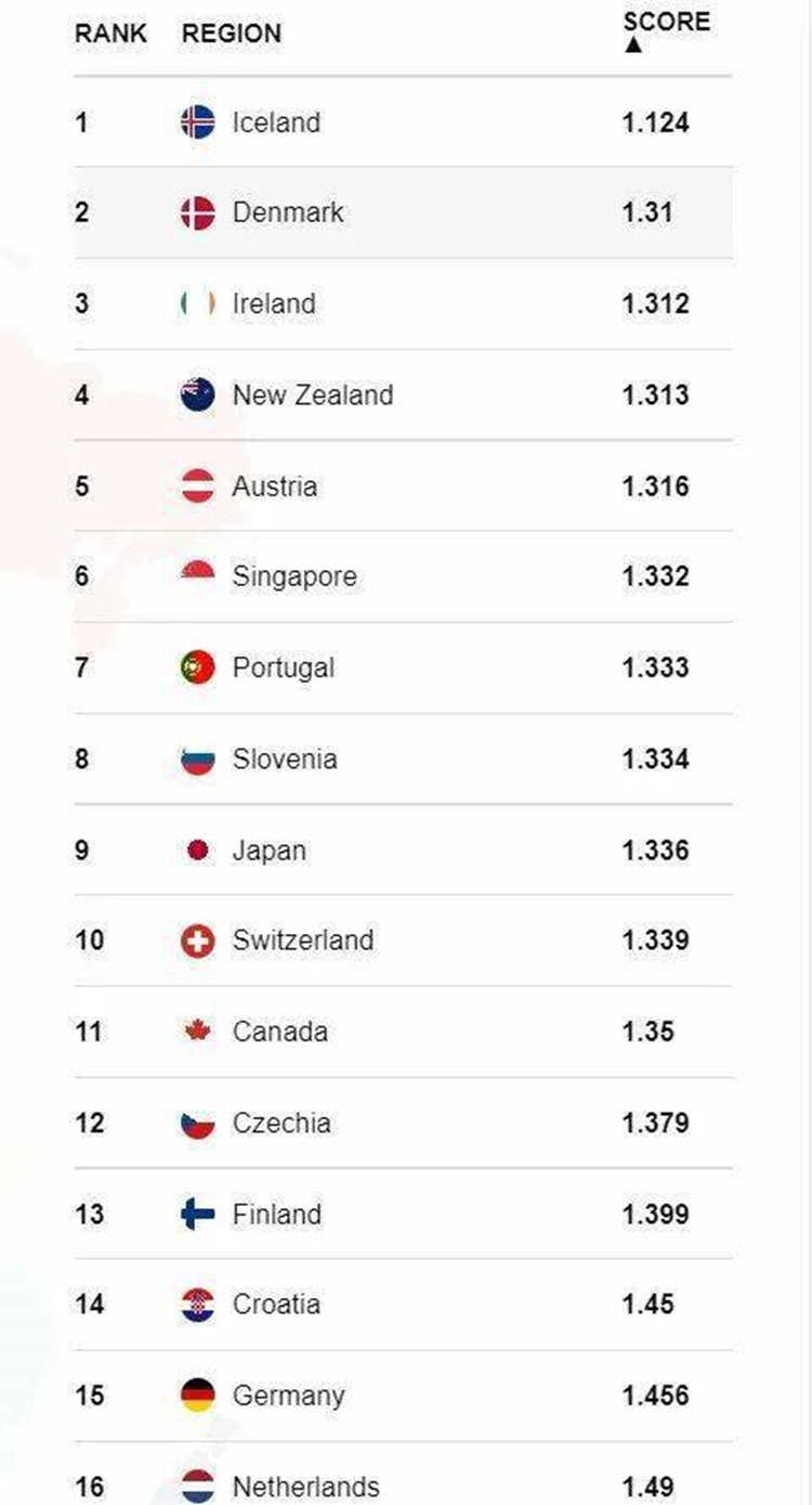 丹麦排名第二,这个国家社会福利出众,贫富差距非常小,犯罪率和腐败率较低,每年不安全事件极少,所以安全指数和国民的幸福指都很高。
