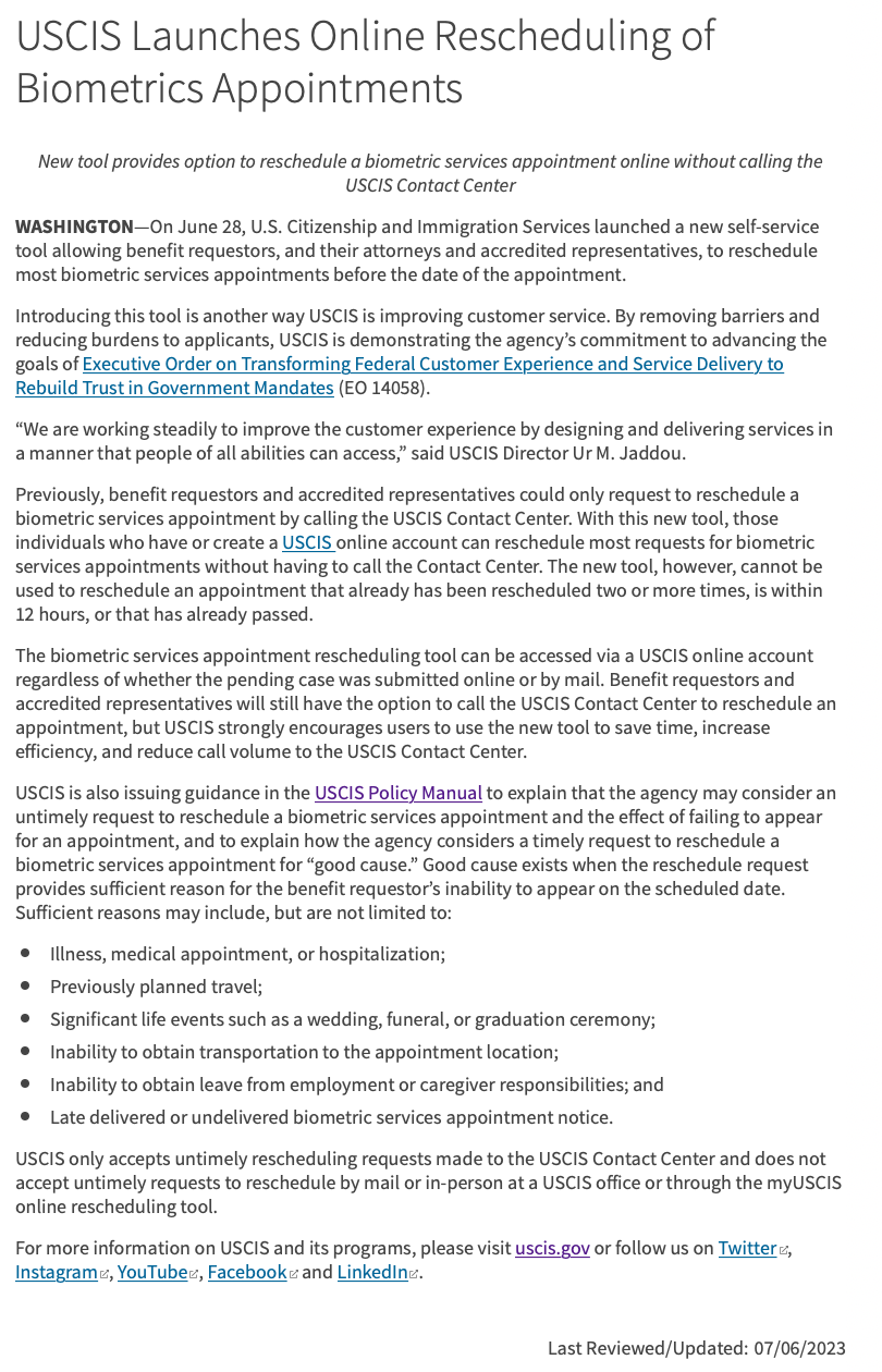 美国公民及移民服务局(USCIS)7月6日宣布,申请人现在可以在线重新预约生物识别(Biometrics,包含打指模)的日期。