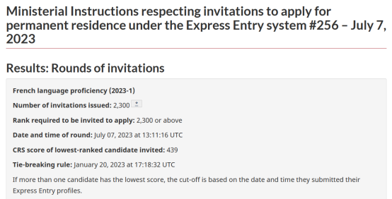 加拿大时间2023年7月7日,联邦快速通道Express Entry第256次邀请,本次针对法语熟练类别进行邀请。分数线439,邀请2300人。刚好439分的申请人,需要在2023年1月20日前入池。