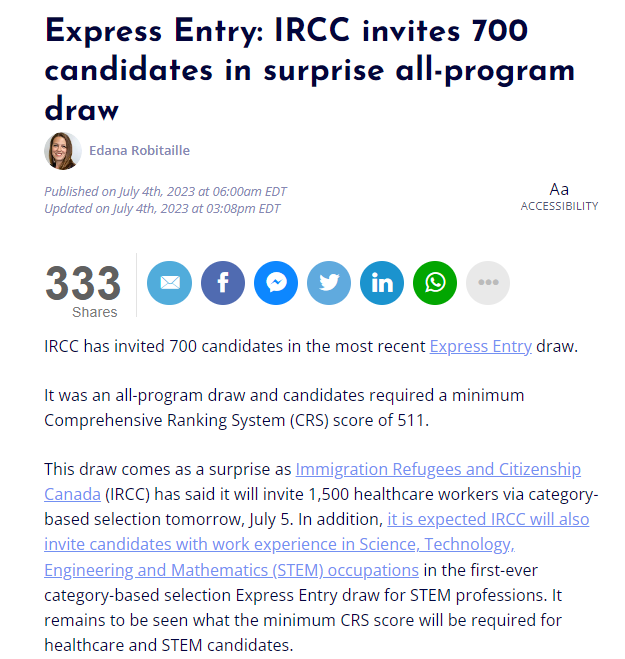 1、IRCC在最近一次抽签中邀请700名快速通道候选人。这是含所有项目的抽签,要求综合排名系统(CRS)的最低分数为511分。这一抽签是令人意外的,因为加拿大移民难民和公民协会(IRCC)表示,将于7月5日通过类别选择邀请1500名医护人员。此外,预计IRCC还将邀请具有科学、技术、工程和数学(STEM)职业工作经验的候选人参加首次基于类别的STEM职业快速入学抽签。医疗保健和STEM候选人的最低CRS分数还有待观察。