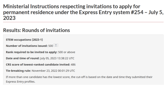 2、加拿大时间2023年7月5日,联邦快速通道Express Entry第254次邀请,本次针对STEM(Science, Technology, Engineering and Math)职业类别进行邀请。分数线486,邀请500人。刚好486分的申请人,需要在2022年11月23日前入池。
