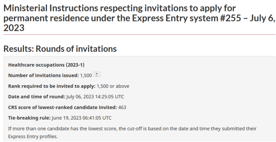 3、加拿大时间2023年7月6日,联邦快速通道Express Entry第255次邀请,本次针对医疗保健职业类别进行邀请。分数线463,邀请1500人。刚好463分的申请人,需要在2023年6月19日前入池。