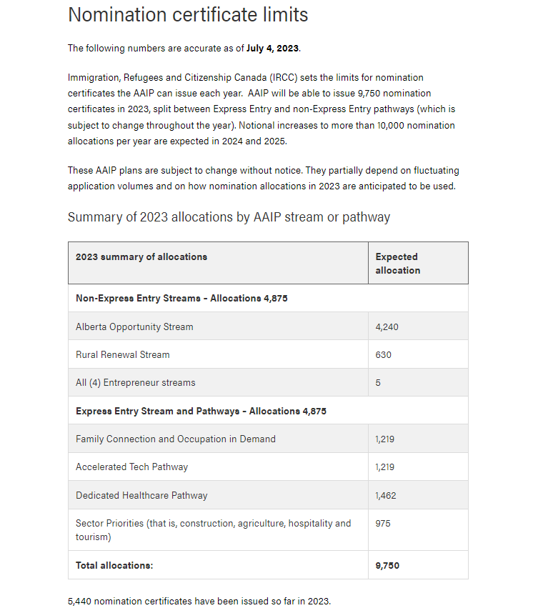 加拿大移民局(IRCC)规定了AAIP每年可以签发的提名证书的限额。2023年,AAIP将签发9750份提名证书,在快速通道和非快速通道境途径之间分配(这在全年内可能会有变化)。预计在2024年和2025年,增加到每年超过10,000份提名配额。这些AAIP计划可能会改变,恕不另行通知。它们部分取决于波动的申请量和2023年的提名配额如何使用的情况。截止2023年7月4日,已签发5,440份提名证书。