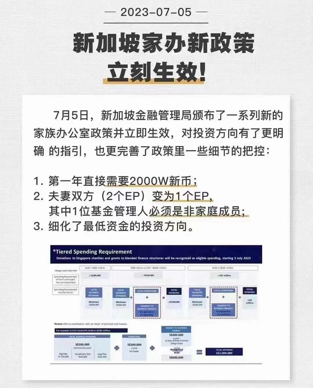 7月5日,新加坡金融管理局颁布了一系列新的家族办公室政策并立即生效,对投资方向有了更明确的指引,也更完善了政策里一些细节的把控。