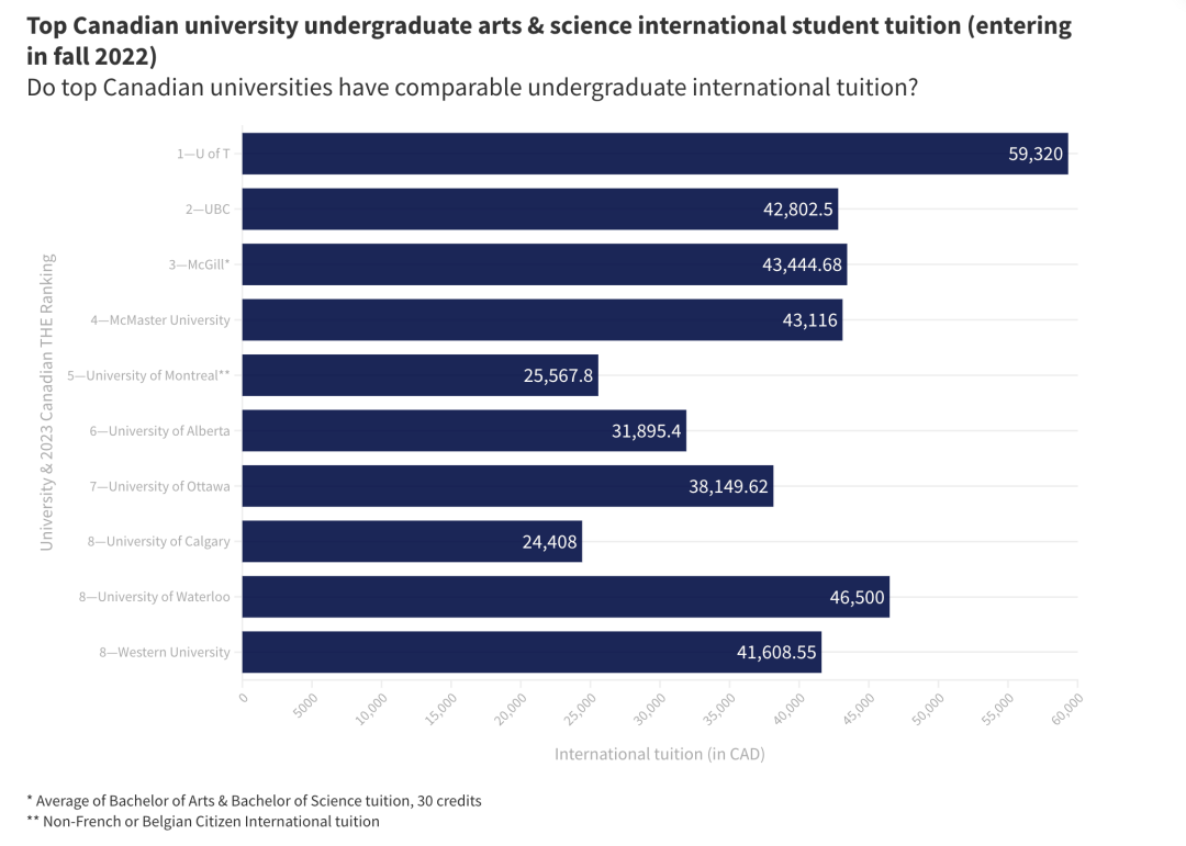 多伦多大学的国际本科生学费比 UBC 大学高出 39%,比麦吉尔大学高出 37%。