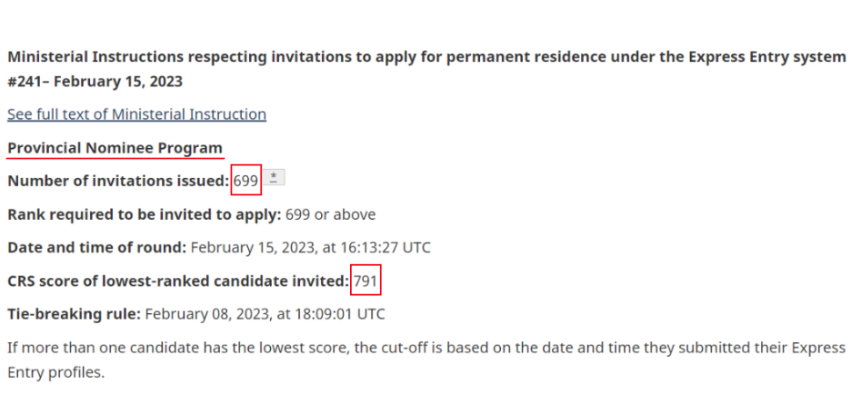 2023年2月15日,广受申请人欢迎的加拿大联邦快速通道(EE)公布了新一轮移民邀请,此轮只针对PNP省提名类别进行抽签,有699人被抽中,邀请分数为791分。