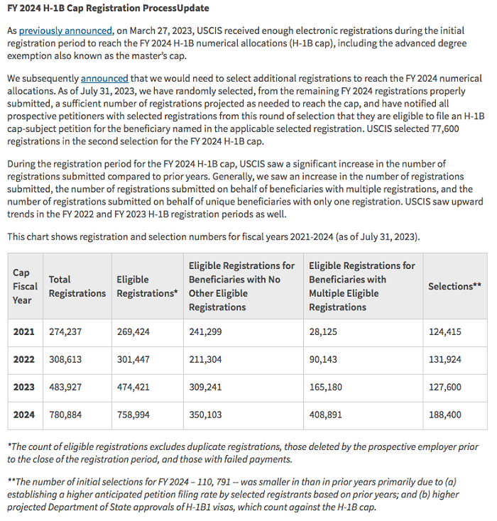 根据美国移民局的消息,截止到2024财年,第二轮筛选中共有77,600名申请者被选中。USCIS官方数据显示,经过两轮抽签,2024财年H1B抽签总数为188,400人,整体中签率约为24.8%。