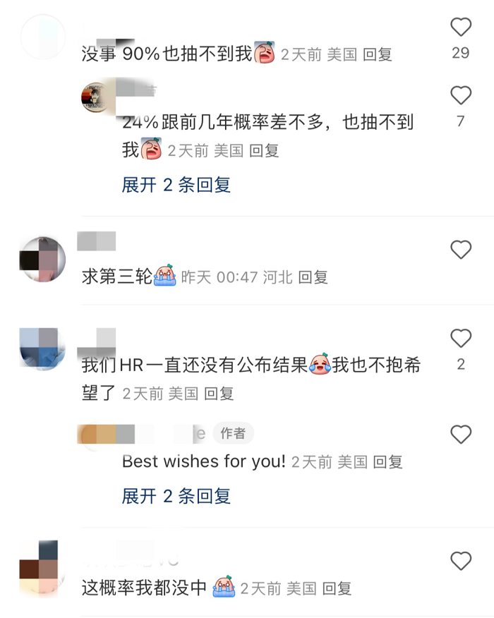 目前,一些幸运的申请者已在社交媒体上分享了自己被抽中的喜悦;然而,也有很多申请者表示遗憾:虽然有77,000多人被抽中,但自己依旧没有中签...