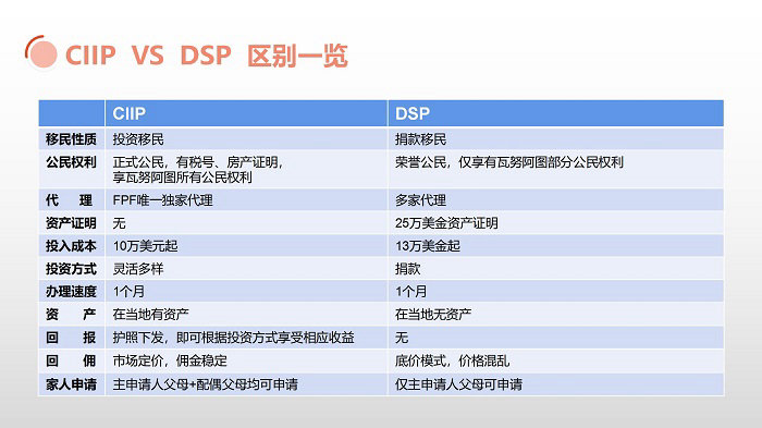 关于瓦努阿图DSP移民与CIIP投资移民的具体区别详见下表: