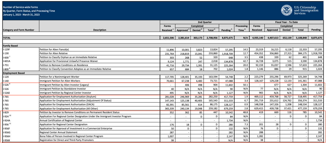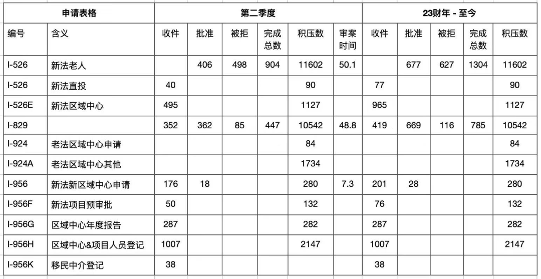 从表中可以看出,2023财年上半年,即2022年10月-2023年3月底,新EB-5法案下(I-526E)已收件数965,目前积压数1127。