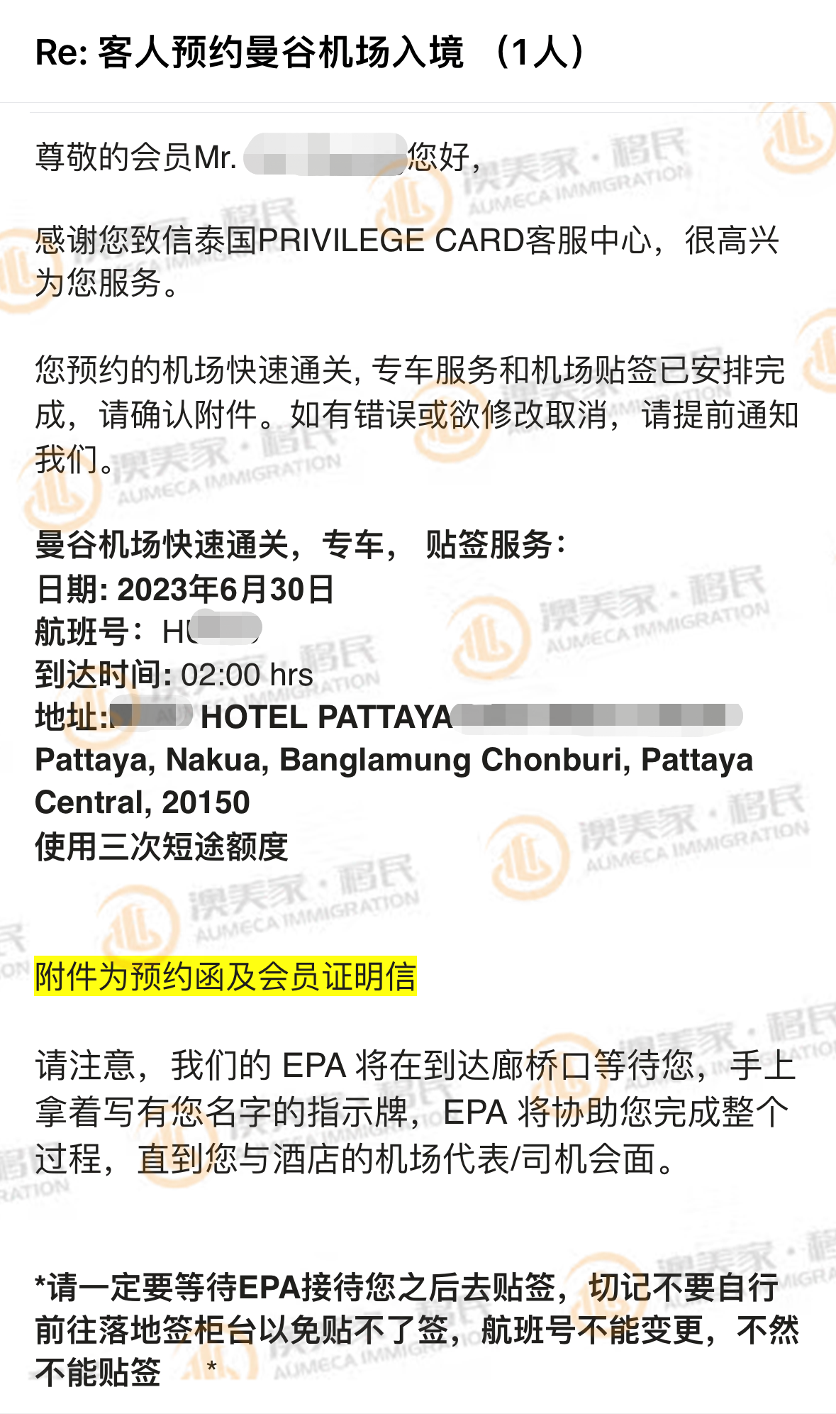恭喜澳美家小伙伴Esther的客户Q先生即将登陆泰国曼谷进行精英签证贴签,会有专人在机场等候接机协助完成贴签,并且有免费专车从曼谷机场接机送到芭提雅。