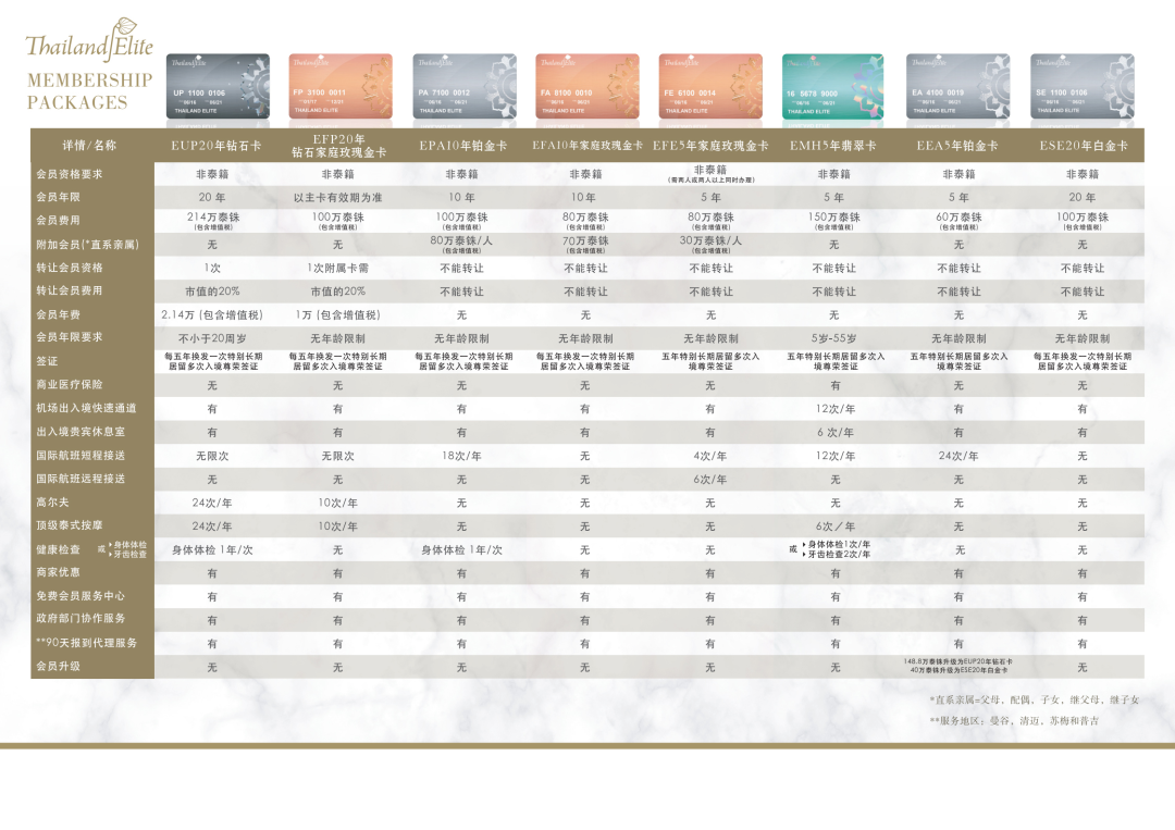 ● EFP 20年钻石家庭玫瑰卡:在主申请人开通EUP 20年钻石卡,100万泰铢